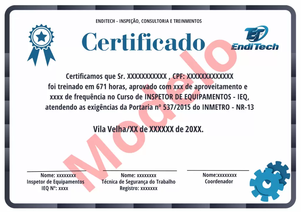 O Curso de Inspetor de Equipamentos, conforme a Portaria INMETRO nº 537/2015, não exige certificação por nenhum órgão certificador, como SNQC, SEQUI, CREA ou outros similares. Ou seja, ao concluir o curso, o profissional estará qualificado como Inspetor de Equipamentos, apto a atuar em todo o território nacional.