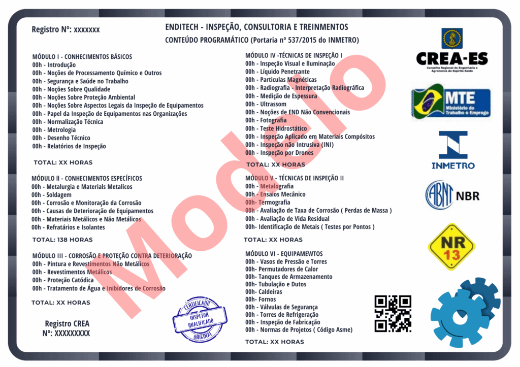Em conformidade com a Portaria INMETRO nº 537/2015 e a Lei de Diretrizes e Bases da Educação (LDB – Lei 9.394/96), o curso garante que a metodologia e o conteúdo atendam aos requisitos técnicos para a qualificação de inspetores de equipamentos.